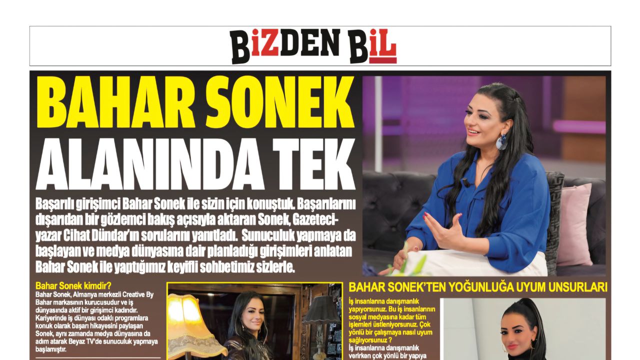 Bahar Sonek, Almanya merkezli Creative By Bahar markasının kurucusudur ve iş dünyasında aktif bir girişimci kadındır. Kariyerinde iş dünyası odaklı programlara konuk olarak başarı hikayesini paylaşan Sonek, aynı zamanda medya dünyasına da adım atarak Beyaz TV'de sunuculuk yapmaya başlamıştır.