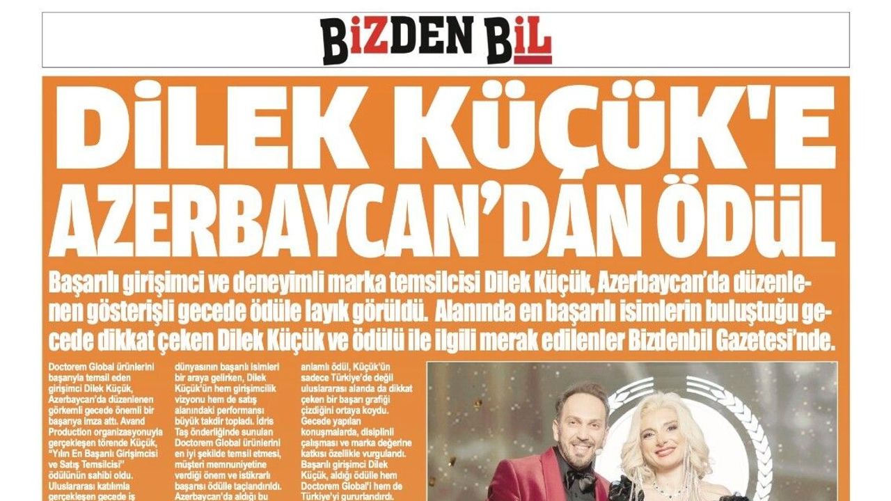 Doctorem Global ürünlerini başarıyla temsil eden girişimci Dilek Küçük, Azerbaycan’da düzenlenen görkemli gecede önemli bir başarıya imza attı. Avand Production organizasyonuyla gerçekleşen törende Küçük, “Yılın En Başarılı Girişimcisi ve Satış Temsilcisi” ödülünün sahibi oldu. Uluslararası katılımla gerçekleşen gecede iş dünyasının başarılı isimleri bir araya gelirken, Dilek Küçük’ün hem girişimcilik vizyonu hem de satış alanındaki performansı büyük takdir topladı. İdris Taş önderliğinde sunulan Doctorem Global ürünlerini en iyi şekilde temsil etmesi, müşteri memnuniyetine verdiği önem ve istikrarlı başarısı ödülle taçlandırıldı.